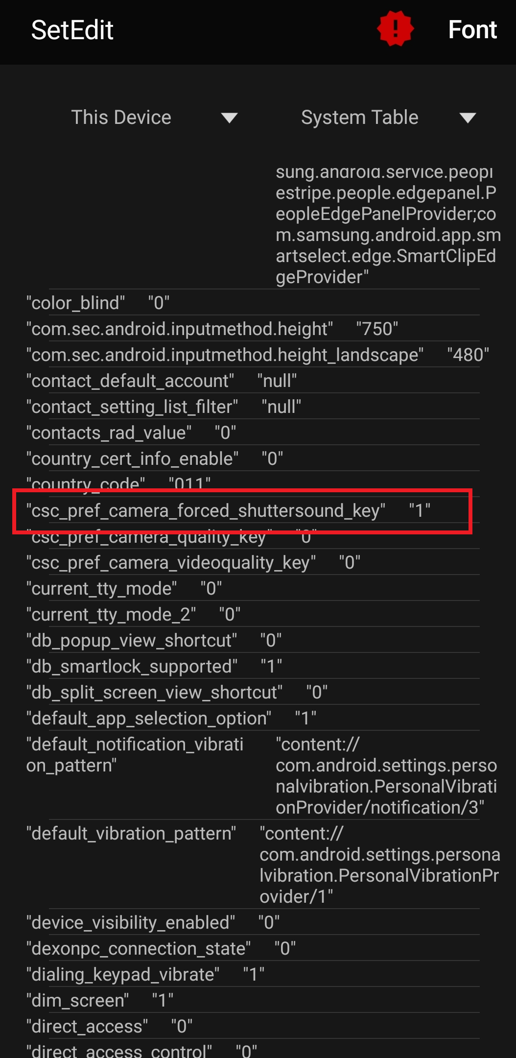 csc_perf_camera_forced_shuttersound_key 항목을 선택하고 아래와 같이 수정 합니다.