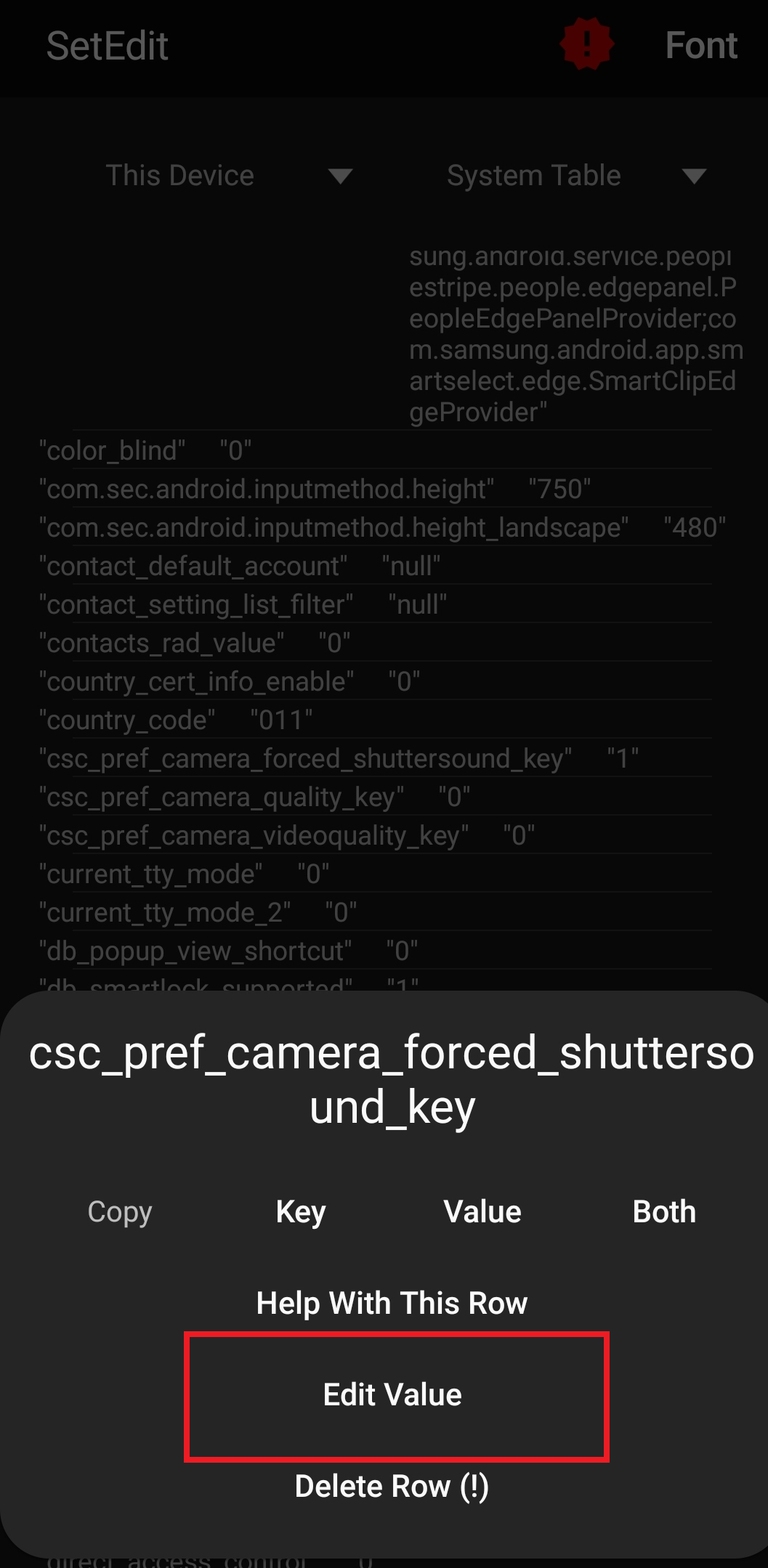 csc_perf_camera_forced_shuttersound_key 항목을 선택하고 아래와 같이 수정 합니다.