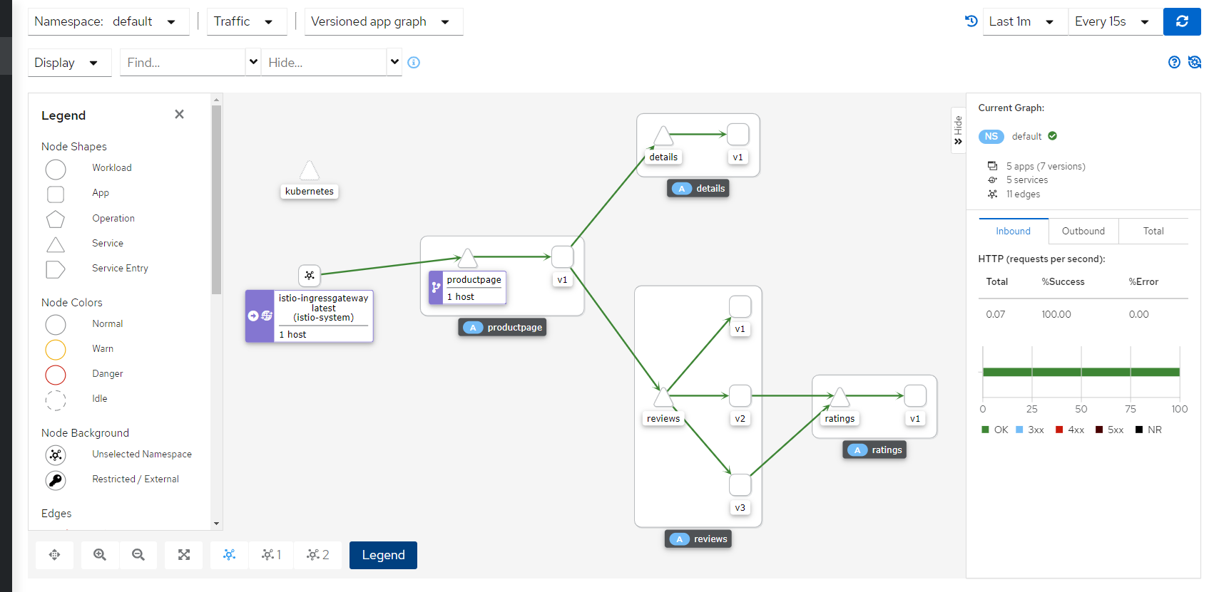- 서비스 메시의 구조, 메시의 토폴로지, 메시의 상태 분석# 프로메테우스 kubectl apply -f https://raw.githubusercontent.com/istio/istio/release-1.12/samples/addons/prometheus.yaml # kiali 및 기타 애드온 설치 및 배포 kubectl apply -f samples/addons # kiali 대시보드 액세스 istioctl dashboard kiali # kiali 대시보드에서 왼쪽 탐색 메뉴 > 그래프를 선택 > 네임스페이스 드롭다운 > default 선택 # 추적 데이터를 보려면 서비스 요청을 보내야 함 # 요청수는 Istio의 샘플링 속도에 따라 다름 # 설치시 속도를 설정 # 100개의 요청을 productpage서비스에 보내려면 다음 명령어 실행 for i in $(seq 1 100); do curl -s -o /dev/null "http://$GATEWAY_URL/productpage"; done