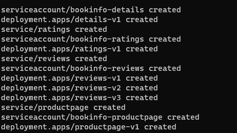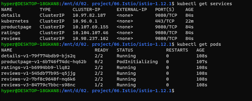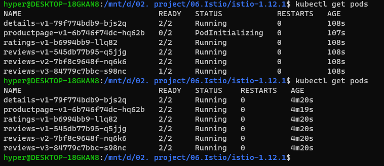 # bookinfo 어플리케이션 배포 kubectl apply -f samples/bookinfo/platform/kube/bookinfo.yaml # 어플리케이션 시작 확인 및 Istio 사이드카 배포 kubectl get services # 팟 확인 kubectl get pods