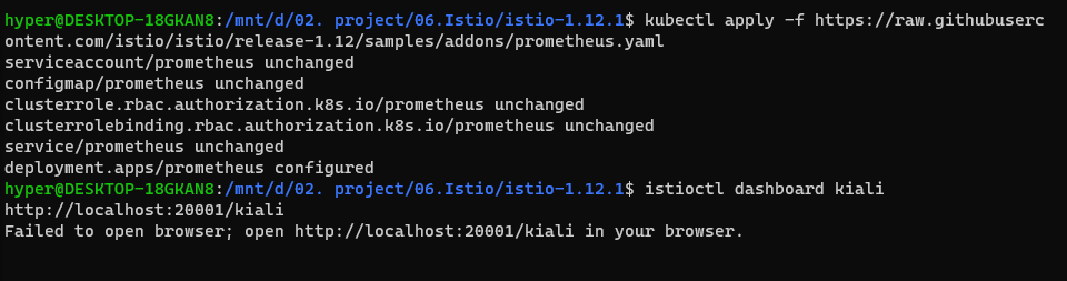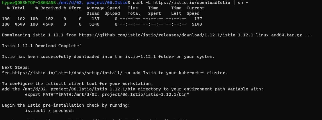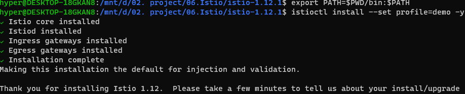 # 다운로드시 폴더 생성 curl -L https://istio.io/downloadIstio | sh - # 폴더로 이동 cd istio-1.12.1 # path 설정 export PATH=$PWD/bin:$PATH