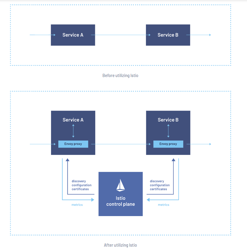 마이크로 서비스 아키텍처 구조에서 각 서비스들 간의 트래픽을 제어하는 역할 수행- Istio는 기존 분산 애플리케이션에 투명하게 계층화되는 오픈 소스 서비스 메시