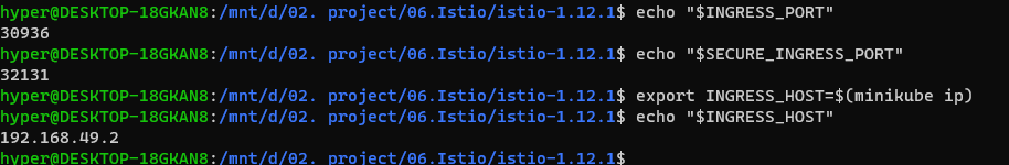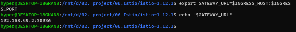 # 수신 포트 설정 export INGRESS_PORT=$(kubectl -n istio-system get service istio-ingressgateway -o jsonpath='{.spec.ports[?(@.name=="http2")].nodePort}') export SECURE_INGRESS_PORT=$(kubectl -n istio-system get service istio-ingressgateway -o jsonpath='{.spec.ports[?(@.name=="https")].nodePort}') # 환경변수 할당 확인 echo "$INGRESS_PORT" echo "$SECURE_INGRESS_PORT" # 수신 IP 설정 export INGRESS_HOST=$(minikube ip) # 수신 IP 확인 echo "$INGRESS_HOST" # 새 터미널 창에서 Istio Ingress Gateway로 트래픽을 보내는 미니쿠베 터널 시작 minikube tunnel # 게이트웨이 URL 설정 export GATEWAY_URL=$INGRESS_HOST:$INGRESS_PORT # 설정 확인 echo "$GATEWAY_URL"