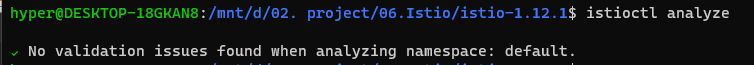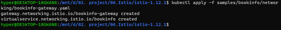 - 액세스 할수 있도록 메시의 경로에 대한 매핑을 하는 Istio Ingress Gateway 생성# 어플리케션을 Istio 게이트웨이와 연결 kubectl apply -f samples/bookinfo/networking/bookinfo-gateway.yaml # 구성에 문제 없는지 확인 istioctl analyze